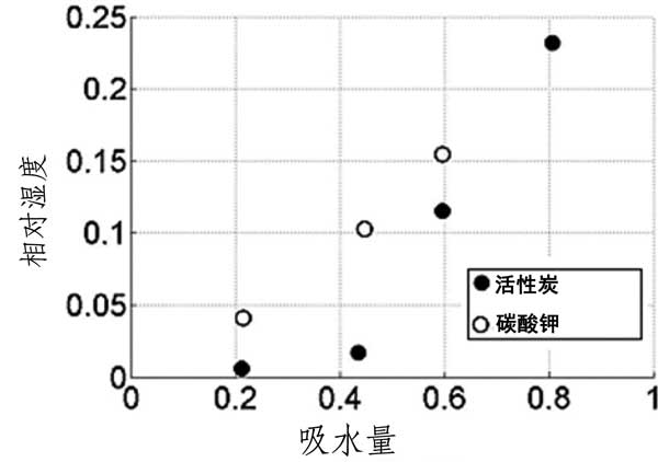 根據以前的測試結果,當相對濕度在6至10%的范圍內并且其在40%以上潮解時,碳酸鉀在25℃開始水合。如圖2所示活性炭載體和吸附劑在40℃下的水吸附容量。活性炭載體的吸收在相對濕度為60%下急劇增加,在相對濕度為80%下達到最大23%的重量增加。在那里,吸附劑的吸收量幾乎是載體的6倍,并且最重要的是,它遠遠高于理論上形成碳酸鉀倍半水合物所需的量。這種顯著差異的原因是鹽在約相對濕度為43%下潮解,因此所有過量的水在載體材料的孔中冷凝,產生鹽的水溶液。