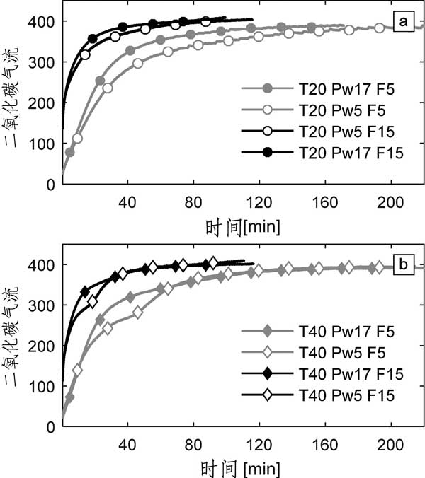 圖3:(a)20°C和(b)40°C實驗的二氧化碳突破。