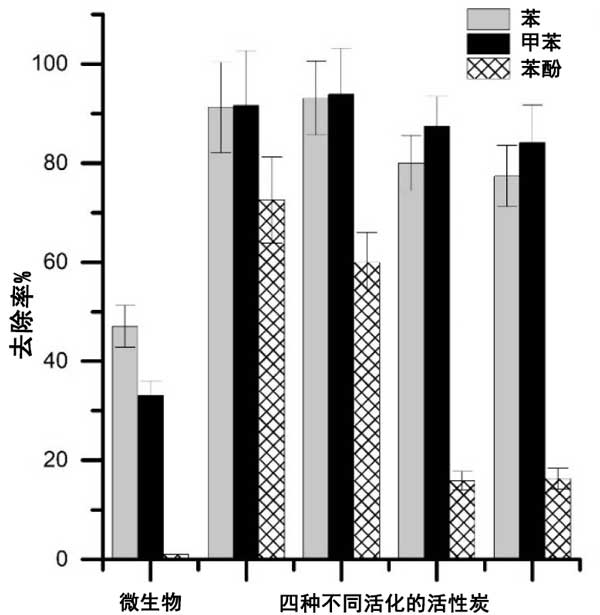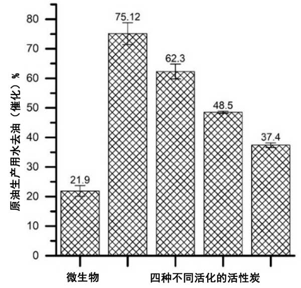 簡(jiǎn)而言之,使用活性炭(60%-93%)和載微生物活性炭(16%-84%)比游離的無(wú)活性炭載體的微生物(1%-47%)更好地去除芳香烴。材料的孔隙率和吸附偶極性有利于吸附。常規(guī)活性炭表現(xiàn)出高度的微孔性,其中可以容納分子量約為100的苯,甲苯和苯酚。活性炭的非極性特征保證了碳?xì)浠衔锏氖杷Γ彩欠菢O性的。活性炭陽(yáng)離子表面有利于芳烴保留,因?yàn)榉辑h(huán)中的π電子與表面陽(yáng)離子靜電連接。使用常規(guī)活性炭和載微生物活性炭的原油去除能力如圖3所示。使用游離的微生物和油-鹽水乳液作為對(duì)照。