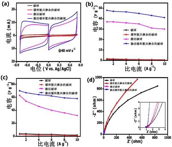 圖3顯示了在中性電解質(zhì)溶液3M KNO 3中,活性炭電極在正和負(fù)工作電位范圍內(nèi)的電化學(xué)分析結(jié)果。碳球和活性炭的相應(yīng)CV曲線呈現(xiàn)出準(zhǔn)矩形形狀,表示特征性的雙電層電容行為(圖3a)。正如預(yù)期的那樣,硼氮摻雜碳的CV曲線形狀比碳球的矩形更加矩形,因此顯示出較小的電阻碳表面。對碳球和硼氮摻雜碳觀察到的低電流響應(yīng)歸因于缺乏多孔結(jié)構(gòu),限制了電極和電解質(zhì)界面之間的離子擴(kuò)散和傳輸。相反,活性炭和硼氮摻雜活性炭的電流響應(yīng)由于在碳表面,然后促進(jìn)更好的電解質(zhì)-電極表面相互作用和增強(qiáng)的離子擴(kuò)散進(jìn)入孔隙較高。與未摻雜的碳球相比,硼氮摻雜活性炭由于其高表面積和硼氮和氧雜原子的存在而產(chǎn)生很高的電流響應(yīng)。
