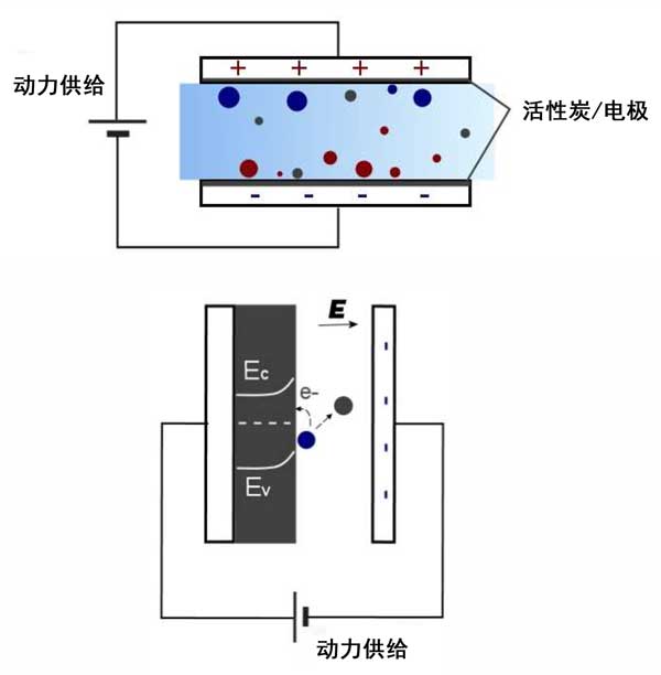 電吸附效應包括向半導體氣體傳感器的敏感層施加外部電場,以改變其感應行為。當負電分子接近薄金屬導體的表面時,自由電子從固體表面被吸引。重要的是,如果處理具有較少可用位移電荷的半導體(例如活性炭),則靜電吸引所涉及的層的厚度將較大,而電導率將較低。半導體電性能的這種變化是金屬氧化物(MOS)氣體傳感器的基本操作。如果將所述系統放置在電場之間,例如通過在兩個電極之間施加電壓來感應,該電場可能會迫使電子朝向(或遠離)(半)導體表面,從而降低(或增加)吸附某些氣態物種(圖1)。