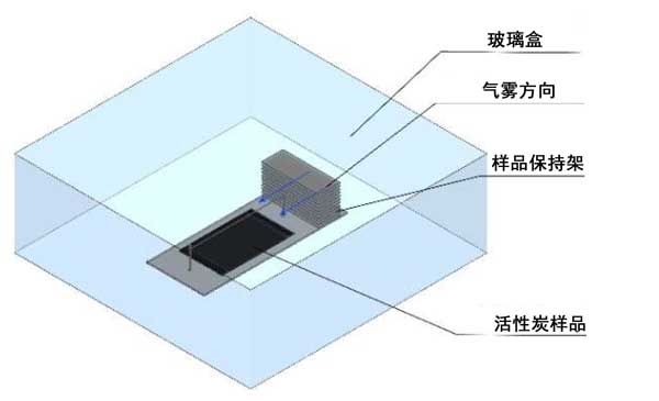 活性炭關于電場附增強吸附測試設備,由一個樣品架組成,樣品架放置在一個33厘米×33厘米×12厘米的帶有硼硅酸鹽玻璃壁的盒子內(圖3)。風扇(位于偏轉板后面)引起平行的空氣通量到樣品。在細的(直徑為180 µm)鎢絲電極(放電電極)上施加正電勢,而相對電極(活性炭)通過兩端的兩個接地連接接地。