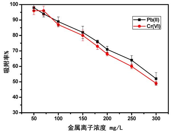 金屬離子濃度的影響:使用0.80 g和1.00 g的活性炭在50至300 mg/L的各種濃度的Pb(II)和Cr(VI)濃度下進行Pb(II)和Cr(VI)離子的吸附。圖3中的結果表明,Pb(II)和Cr(VI)離子的最大吸附量分別為50和70 mg/L。這可以歸因于以下事實:隨著濃度的增加,活性部位被覆蓋并飽和。
