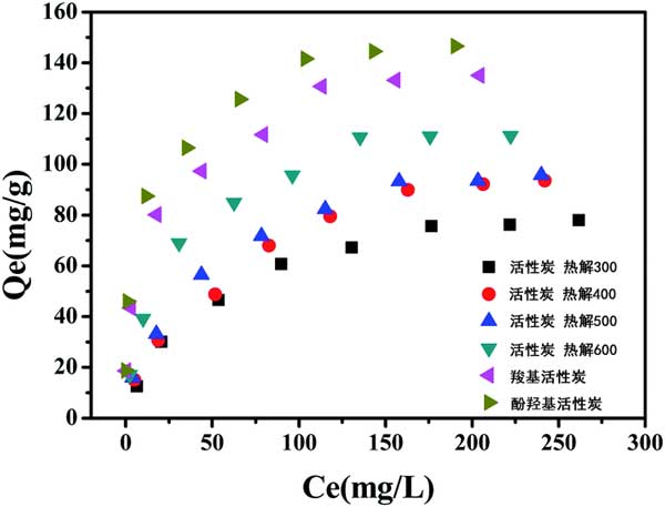 大量研究表明,有機(jī)污染物在水介質(zhì)上的吸附包括分配和吸附作用。為了評(píng)估在活性炭上吸附化合物時(shí)在碳化相中的吸附和在非碳化相中的分配的貢獻(xiàn),雙模式模型在該研究領(lǐng)域中被成功引用。通過雙模式模型計(jì)算了多菌靈在不同濃度的活性炭上的分配和吸附。在該實(shí)驗(yàn)中,雙模型為所有樣品的等溫線提供了良好的擬合(圖3)。在本研究中,所有活性炭上多菌靈的吸附均大于分配所有多菌靈濃度的吸附。但是,隨著多菌靈濃度的增加,分配(Q p)和吸附(Q ad)對(duì)總吸附的貢獻(xiàn)也不同。在低濃度范圍內(nèi),吸附大于在活性炭上的分配,并且Q ad值貢獻(xiàn)超過總吸附的97%。但是,在高濃度范圍內(nèi),多菌靈對(duì)不同樣品在整體吸附中的分配和吸附的貢獻(xiàn)不同。當(dāng)多菌靈的濃度達(dá)到300 mg L-1時(shí)在熱解300、400、500攝氏度的活性炭上,吸附對(duì)總吸附的貢獻(xiàn)仍然遠(yuǎn)遠(yuǎn)大于分配作用。盡管活性炭中含O官能團(tuán)的含量逐漸減少,但分配對(duì)總吸附的貢獻(xiàn)率卻逐漸增加,特別是對(duì)于羧基活性炭和酚羥基活性炭,它們的Q p值分別達(dá)到39.4%和44.13%。主要原因可能是樣品表面上含O官能團(tuán)的減少導(dǎo)致更好地暴露于樣品表面和多菌靈濃度增加,從而導(dǎo)致吸附過程飽和。因此,多菌靈可以分配給非碳化相。