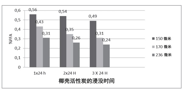 圖1:椰殼活性炭FFA數與粒徑和浸沒時間的關系。