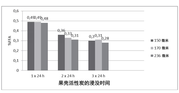 活性炭浸入進行1、2或3天。從圖中可以看出,浸泡1天的FFA值在0.4-0.5%的范圍內。浸泡兩天的FFA范圍不同(0.3-0.4%)。此外,浸泡3天的油中FFA很低,為0.2-0.3%。根據這項研究,發現活性炭可降低食用油的FFA。重要的是要強調指出,使用農業廢料制成活性炭來處理水性廢水(主要作為替代性吸附材料)可能是一個優勢,因為它們可以去除廢水中的惰性污染物,并且可以很大程度地減少因不適當處理這些廢水而造成的環境影響。