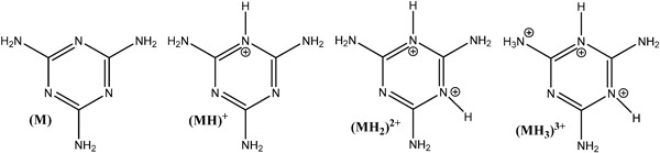 優化了活性炭的用量和三聚氰胺溶液濃度范圍的影響,以實現定量分析吸附前后,以及這些研究中使用的所有活性炭中三聚氰胺的最佳條件。最初的實驗涉及不同的吸附劑劑量,以及用于吸附物檢測和定量的多種方法。通過考慮三聚氰胺在水中的溶解度(酸性和堿性條件)以及吸附實驗前后溶液中的可測量水平來選擇三聚氰胺溶液的濃度范圍。由于三聚氰胺(M)是堿,因此它可以在水溶液中經歷幾次酸/堿平衡反應并形成不同的質子化物質(見圖1)。