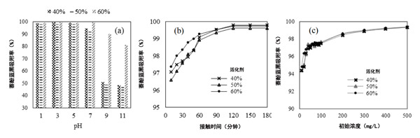溶液PH影響活性炭的表面電荷。因此,它是控制活性炭吸附過程的重要因素之一。圖2(a)中描述了萘酚藍黑在以40%,50%和60%的活化劑制備的活性炭上的吸附。在所研究的pH范圍內(pH介于1和11之間),萘酚藍黑在活性炭上的吸附是pH依賴性的,尤其是在pH 5和11之間。在低pH值下,活性炭表面帶有凈正電荷。pH的增加導致凈正電荷的減少和凈負電荷的增加。萘酚藍黑是具有負電荷的陰離子染料。在pH值為3時,它會在活性炭表面的活性位點(即,官能團)與被吸附物分子(即,萘酚藍黑)之間引起靜電吸引;钚蕴康幕钚圆课慌c萘酚藍黑色分子之間的靜電排斥作用占主導。因此,可以得出結論,將萘酚藍黑色吸附到活性炭上的pH值選擇為3。另一方面,使用60%活化劑的活性炭吸附時,萘酚藍黑的吸附量比使用40%活化劑活化的活性炭吸附的高,這是由于活性炭產生了更多的孔,盡管在pH 1-3下差異不明顯。