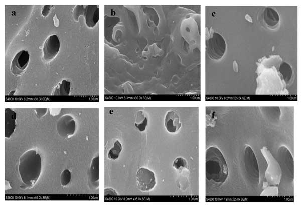 圖2:在0(a),2(b),4(c),6(d),8(e),10(f)循環數后經過再生處理的活性炭的SEM圖像。