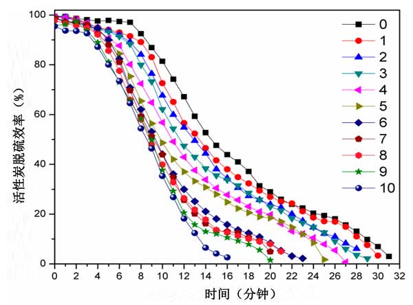 圖3:再生活性炭的脫硫效率,其中0-10代表循環數。
