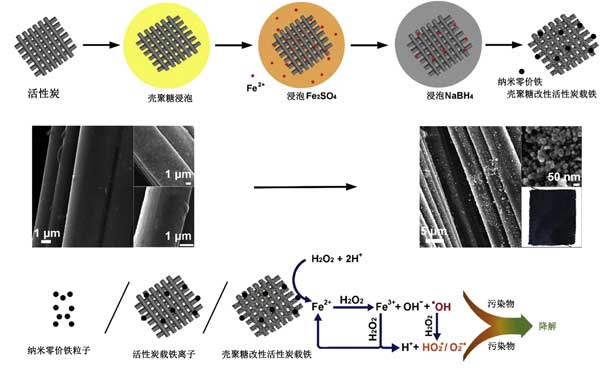 本次一共制備了三種類型的非均相Fenton催化劑,分別是納米零價鐵顆粒,活性炭負載的納米零價鐵和浸漬有納米零價鐵的殼聚糖改性活性炭。通過在活性炭上吸收鐵離子,然后使用NaBH 4原位還原,合成了活性炭負載的納米零價鐵。殼聚糖改性活性炭的制備方法是,先在酸洗過的活性炭上涂覆一層殼聚糖,然后將亞鐵離子螯合到殼聚糖基質(zhì)中,然后將其原位還原為納米零價鐵。這幾種活性炭催化劑的合成過程示意圖如圖1所示。