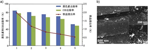 檢查了活性炭催化劑的可重復使用性,以評估其是否經(jīng)過了多個循環(huán)的黑色素處理。圖3顯示了五個處理周期的COD和脫色以及鐵浸出的結(jié)果。一個。盡管觀察到4個循環(huán)后,脫色效率從85%逐漸降低到70%,但是,可以證明活性炭催化劑在Fenton反應中具有合理的可重復使用性。效率的降低可歸因于吸附降解副產(chǎn)物時某些催化劑位點的失活以及在Fenton反應過程中少量鐵的浸出。在每個循環(huán)后對鐵的浸出進行了研究,以表明活性炭的穩(wěn)定性。如圖3所示a,在第一個循環(huán)中浸出鐵離子的量最高,約為初始鐵量的2%。在第三個循環(huán)后,浸出鐵降至<1%,并且在隨后的循環(huán)中保持穩(wěn)定,在第五個循環(huán)時降至0.5%。與將鐵離子浸入溶液中的單獨的納米零價鐵相比,在Fenton類工藝中,亞鐵離子和鐵離子可能會被活性炭吸附/螯合,從而避免了浸出并使反應連續(xù)供入。零碎的鐵損失顯然是活性炭催化劑再利用以及減少鐵淤渣的重要步驟。