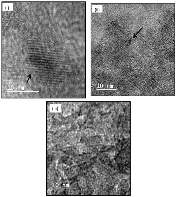 進行了鎳鉬硫化催化劑的TEM分析,以收集有關硫化鉬在載體上的分散性的信息。TEM圖像如圖1所示。對于氧化鋁和活性炭催化劑,在二氧化硅催化劑中未觀察到MoS 2條紋。氧化鋁催化劑中會明顯出現兩到三層MoS 2堆疊,可能是II型活性位。然而,這種類型的活性位點對于活性炭負載的催化劑是不可見的。氧化鋁催化劑的計算平均平板長度為3.19nm。較大的平均平板長度可能與氧化鋁催化劑中較弱的金屬-載體相互作用有關。