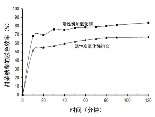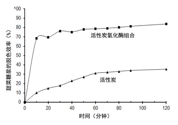 圖2:甜菜糖漿經氧化酶固定的活性炭顆粒和組合的活性炭和氧化酶的脫色。