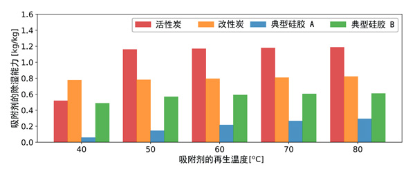 活性炭的除濕能力可以定義為在給定溫度和濕度條件下的有效吸附量,其計算方式為吸附與解吸之間的平衡吸附之差。考慮到實際環(huán)境條件,相當(dāng)于室外空氣條件的吸附條件為干球溫度為32℃,相對濕度為80%。解吸條件是由再生空氣溫度從40℃到80℃給出的,室外空氣條件下的濕度比為24g/kg。計算出的除濕能力如圖1所示。比較了活性炭和典型硅膠(A型和B型硅膠)在不同再生溫度下的除濕能力。在硅膠的情況下,由于缺乏數(shù)據(jù),吸附和解吸之間的磁滯被忽略了,并且預(yù)期它很小。