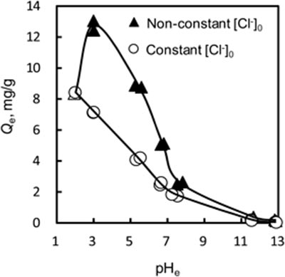 活性炭上的硝酸根離子吸附量與溶液的pH e之間的關系如圖1所示。硝酸根離子在堿性條件下幾乎不被吸附,這意味著氫氧根離子會抑制硝酸根離子的吸附。另一方面,隨著平衡pH的降低,硝酸根離子的吸附量增加。在堿性條件下,由于硝酸根離子與活性炭表面之間的靜電排斥,硝酸根離子很難被吸附在活性炭上。另一方面,硝酸根離子的吸附量在酸性條件下增加,這歸因于硝酸根離子與碳表面之間的靜電吸引力。然而,隨著平衡pH從3.0降低到2.0,觀察到硝酸根離子吸附的顯著降低。在此pH范圍內,氯離子的初始濃度從2 m增加到20 m M,這意味著共存的氯離子會抑制硝酸根離子的吸附。通過NaCl溶液將氯離子的初始濃度固定在20 m M時,可以清楚地發現氯離子對硝酸根離子的吸附抑制作用,表明硝酸根離子在所有pH區域的吸附量均低于沒有任何pH調節的溶液。因此共存陰離子會導致競爭吸附影響硝酸根離子吸附的效果,并且這種作用可能是較強的在共存陰離子的濃度較高。
