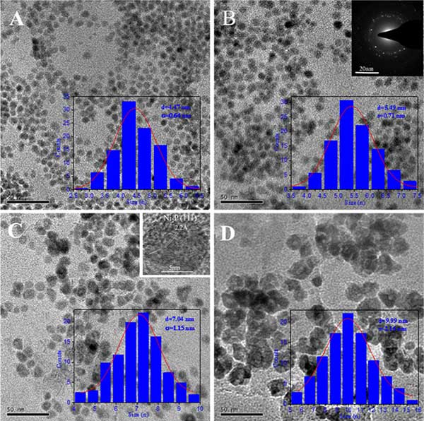 活性炭中鎳的透射電子顯微照片(圖1的A-d),納米粒子為球形且均勻地分布,這表明金屬磷化物納米顆粒的相對尺寸和分散度的化學反應過程中合成。在催化劑合成過程中,油胺起還原劑的作用,從而控制成核速率。同時,三辛基膦用作磷源和穩定劑,通過Ni(0)表面的配位提供可調的表面穩定性。在合成中,對于少量三辛基膦,發生Ni(II)前體的快速還原,導致Ni(0)物質的重要濃度,其不能被溶液中存在的配體有效穩定。然后,快速聚集過程的結果形成大尺寸的磷化鎳納米顆粒在活性炭載鎳催化劑。然而,當油胺的量減少時,制備少量核,并且大量三辛基膦的存在抑制它們的生長,導致形成小的納米顆粒。此外,所選擇的區域的電子衍射和晶格條紋的圖像(在所示圖1 B,C)表明,球形磷化鎳納米粒是單晶。因此,它的尺寸大于Ni 2通過改變油胺和三辛基膦的濃度可以很容易地調節活性炭催化劑,這提供了一種精確控制其尺寸在4到10nm范圍內的方法,在這些方法中,這些磷化鎳納米顆粒在活性炭上以各種尺寸負載將具有不同的屬性可能導致不同的反應性。