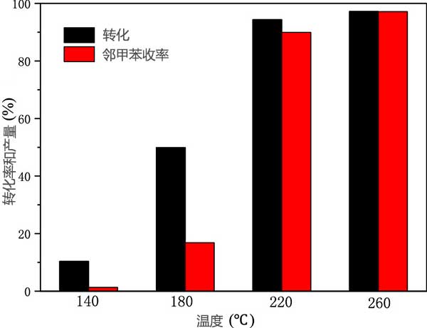 為了評價制備的磷化鎳活性炭的有用性,進行對生物油模型化合物加氫脫氧的活性。在測試中,我們使用SA(水楊醛)作為熱解油的代表性組分來探索加氫脫氧途徑。在這項工作中,SA轉化為鄰甲酚可以通過路徑氫化/氫解或C=O鍵的直接氫解進行。圖2顯示了加氫脫氧相對于鎳的轉化率和產率活性炭受反應溫度影響。結果表明,隨著反應溫度的升高,SA的轉化率和鄰甲酚的收率逐漸增加。當反應溫度為260℃時,鄰甲酚目標產物的產率較大,2小時達到97.1%,這表明反應溫度顯著提高了它的區域選擇性加氫脫氧的催化活性。