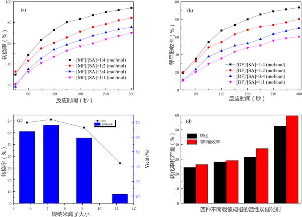 盡管碳水化合物衍生的化合物在加氫脫氧過程中對芳族化合物有影響,但是之前的一些熱解油升級的研究集中在加氫脫氧反應中碳水化合物衍生的化合物和木質素衍生的芳族化合物之間的相互作用。在這次研究中,用活性炭催化從酚級分(SA)產生的碳水化合物衍生物的(MF)的加氫脫氧的熱解油的效果進行了研究(在圖3所示)。MF的存在對SA的轉化和鄰甲酚的收率產生了很大的影響。在不存在MF的情況下,SA的轉化率為99%,持續180分鐘,相應的鄰甲酚產率為97%。隨著反應物中MF比例的增加,SA轉化率和鄰甲酚產率均顯著降低。當(MF)/(SA)值為1.00(mol / mol)時,SA的轉化率和鄰甲酚的收率分別從99%和97%急劇下降至70%和60%,這表明通過在反應物中存在MF,抑制了SA的反應性。