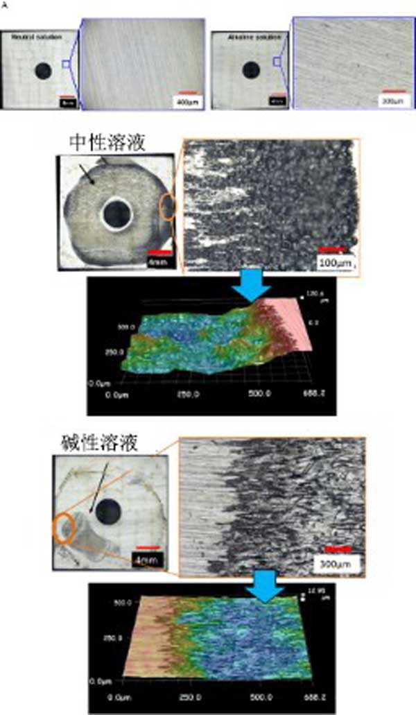 使用光學顯微鏡觀察實驗后樣品的表面形態,如圖3所示。在中性和堿性溶液中未與活性炭接觸的樣品中未觀察到縫隙腐蝕。另一方面,在中性和堿性測試溶液中與活性炭接觸的樣品上發生縫隙腐蝕。這些結果清楚地表明,當樣品與活性炭接觸時,縫隙腐蝕敏感性增加。在中性測試溶液的情況下,最大腐蝕深度為130μm并且縫隙腐蝕傳播以覆蓋樣品的幾乎所有褶皺區域。在堿性測試溶液的情況下,最大腐蝕深度為25μm并且腐蝕區域遠小于中性溶液的情況。這些結果表明,在中性溶液的情況下腐蝕區域和深度更大,這表明在吸附塔中發生實際腐蝕。在堿性溶液的情況下腐蝕面積和深度較小的原因被認為是Fe(OH)2的溶解速率的事實堿性溶液減少,這導致腐蝕速率降低。基本上,在陽極部位的pH降低至去鈍化pH是縫隙腐蝕開始和傳播所必需的。考慮到這個方面,還可以解釋縫隙腐蝕行為的差異。