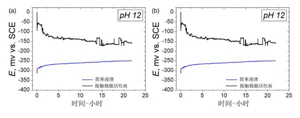 中性和堿性溶液中試樣的開路電位隨時間的變化如圖4所示。與銀浸漬活性炭接觸的樣品的開路電位在最初階段是高的,然后在中性和堿性溶液的實驗開始時急劇下降。根據這些結果,認為在實驗開始時發生縫隙腐蝕,當樣品與銀浸漬活性炭接觸時開路電位降低。結果表明“電化學效應”是嚴重縫隙腐蝕的主要原因。